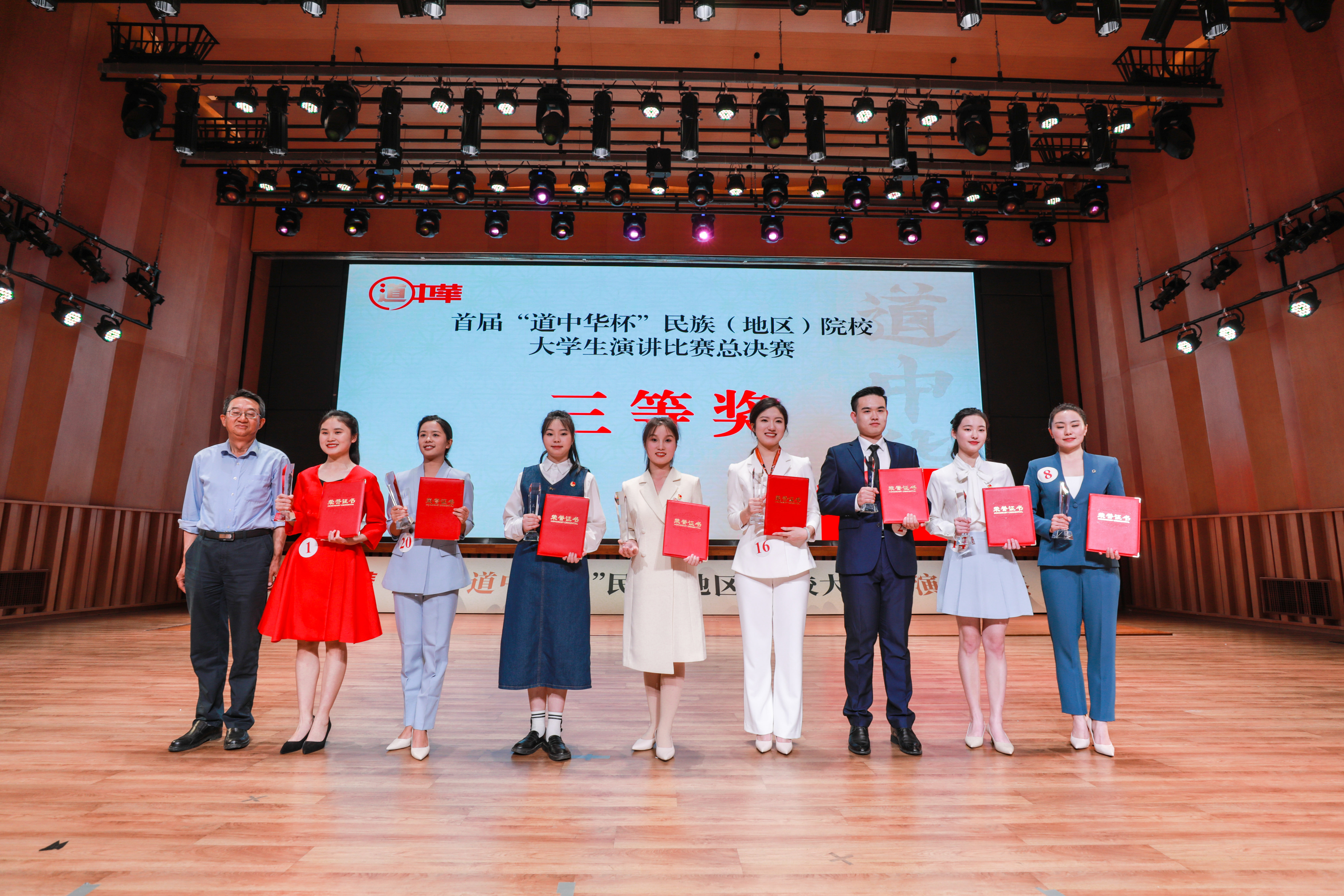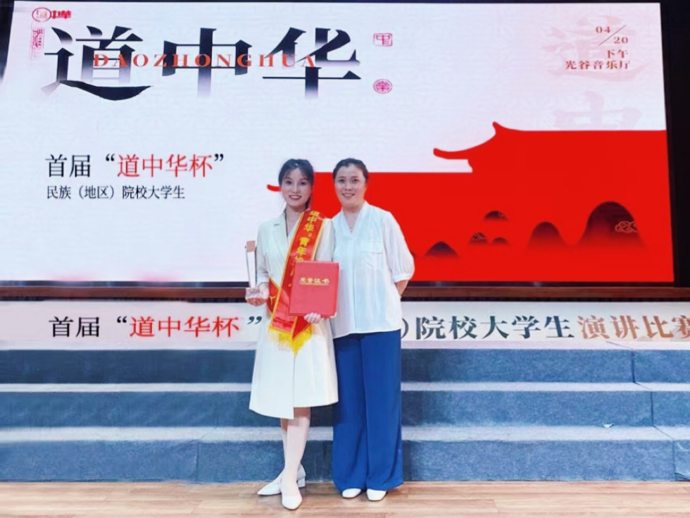 本网讯(通讯员 张宝娣)4月20日下午,首届“道中华杯”民族(地区)院校大学生演讲比赛总决赛在中南民族大学落幕,来自全国的25所民族(地区)院校的25位选手晋级总决赛,经过激烈角逐,我校文学与新闻传播学院2021级学生吴俊霞在25名选手中名列13,荣获三等奖,并被授予“道中华”青年推广人荣誉称号。