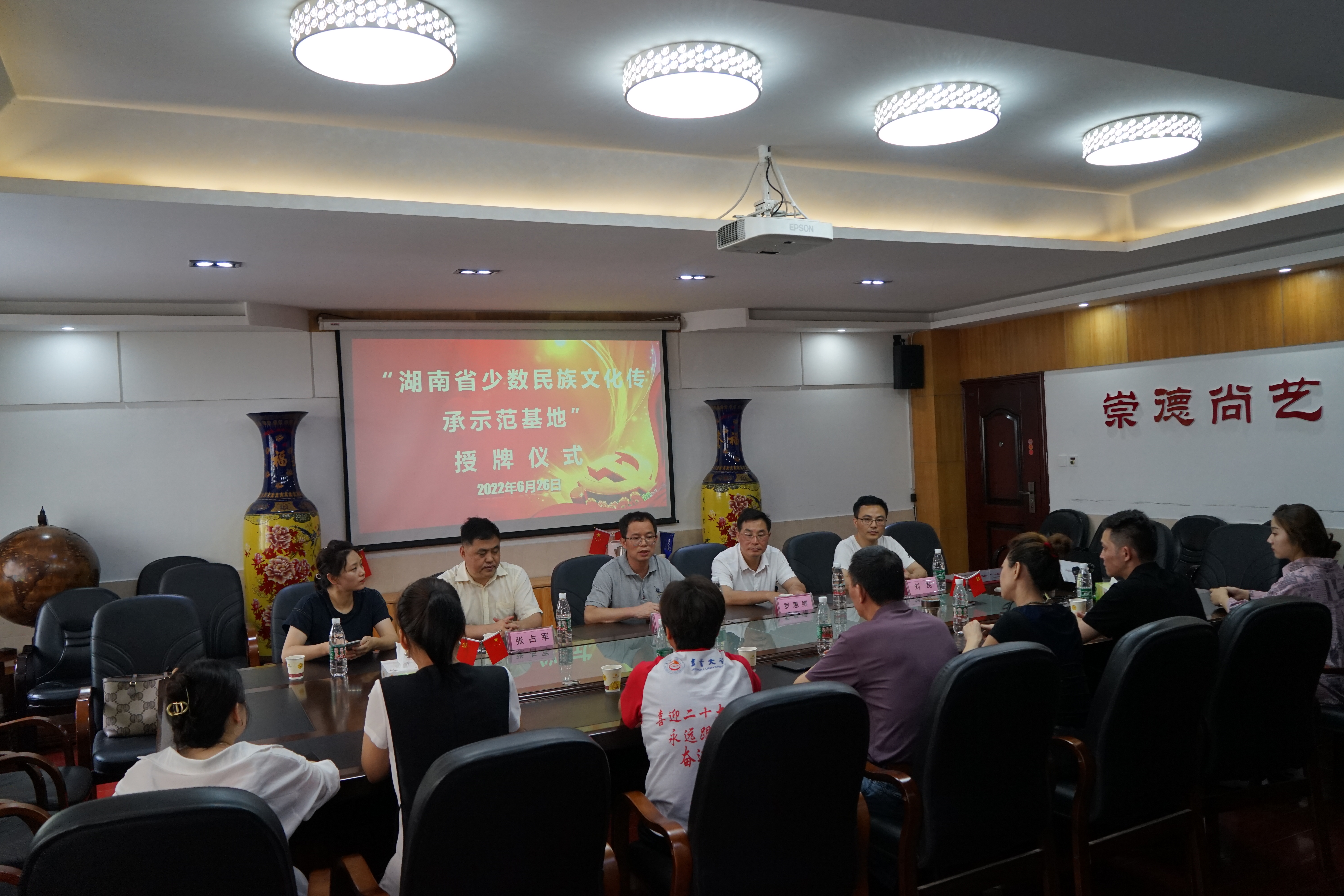 授牌仪式在音乐舞蹈学院会议室进行,湖南省民族宗教事务委员会文化教育处一级调研员张占军,四级调研员刘昆,我校党委委员、宣传部部长罗惠缙、音乐舞蹈学院院长李开沛、院党委书记王元以及音乐舞蹈学院领导班子成员参加了授牌仪式。